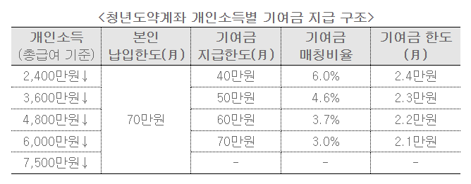 - 개인소득 기준 총 급여 기준 6,000만원 이하는 정부기여금 지급/비과세 적용되며, 총급여 기준 6,000~7,500 만원은 정부기여금 지급 없이 바과세만 적용됩니다.